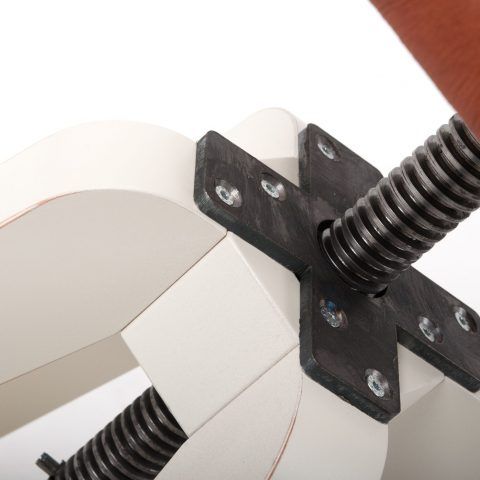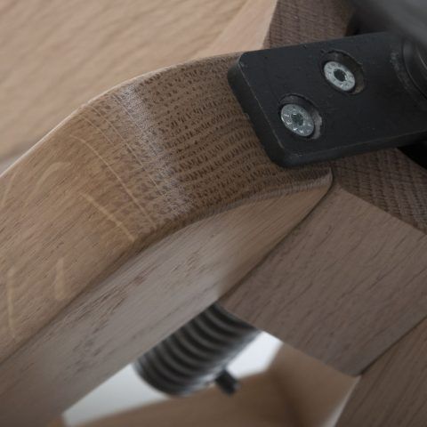 Der Hocker besteht aus einem Massivholz-Zargengestell. Vier Stollen laufen nach oben zu und sind mit einem Sechseck aus Massivholz form- und kraftschlüssig miteinander verbunden. Zwei kreuzende Zargen verbinden die vier Stollen. Der Drehmechanismus aus Metall hat vier Ausleger, durch die mittig die Drehspindel führt. Holzart: Buche oder Eiche. Das Sitzpolster ist aus einer Holzwerkstoffplatte rund ausgefräst. Verbundschaum plus Schaumstoff ist auf die Grundplatte geklebt und komplett mit dem Bezugsmaterial ummantelt.