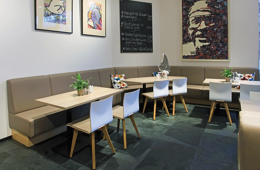 Das zeitlose Design und die Auswahl an Holzarten, Beiztönen und Polsterfarben ermöglichen eine einfache Abstimmung mit vorhandenen Kantinenmöbeln. So fügt sich der Stuhl harmonisch in unterschiedliche Raumkonzepte ein – von der Kantine über den Speisesaal bis zum Besprechungsbereich.